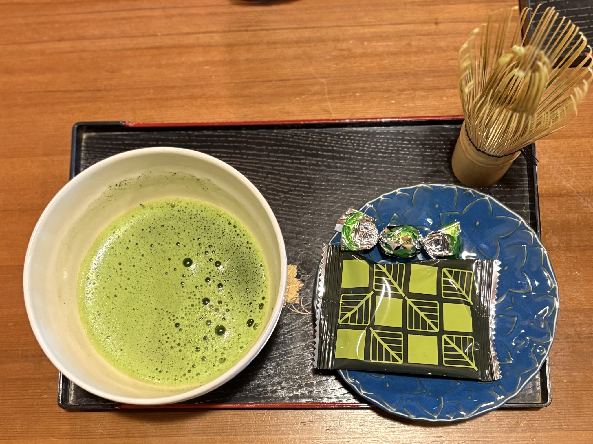 自分で挽いたお抹茶をその場で点てていただく時間は